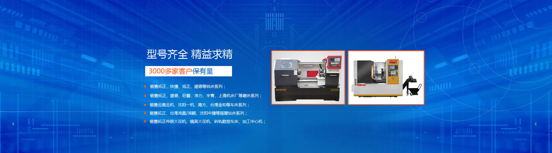 銷(xiāo)售拓正、快捷、旭正、建德等銑床系列;銷(xiāo)售拓正、建德、旺磐、準(zhǔn)力、宇青、上海機(jī)床等磨床;銷(xiāo)售云南云機(jī)、沈陽(yáng)一機(jī)、南方、臺(tái)灣金和等車(chē)床系列銷(xiāo)售拓正、臺(tái)灣鴻昌/鴻穎、沈陽(yáng)中捷等搖臂鉆床系列;銷(xiāo)售數(shù)控雕銑機(jī)、火花機(jī)、加工中心機(jī)、中走絲線(xiàn)切割等。
